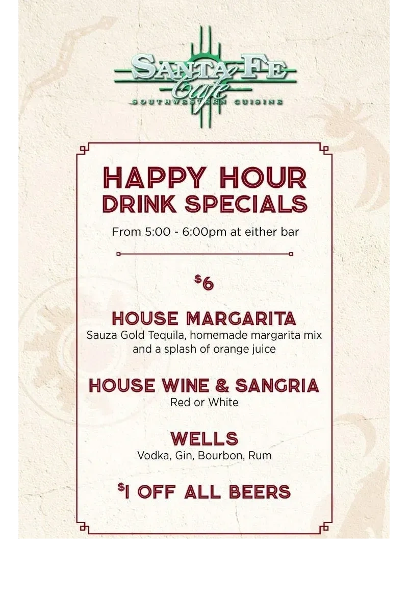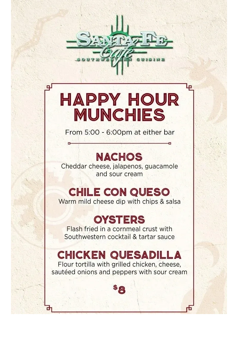 Discover a delightful escape at Santa Fe Cafe’s Happy Hour. Our carefully crafted menu invites you to experience the perfect fusion of flavors. Indulge in our handcrafted cocktails that blend innovation with tradition. From classic favorites to our signature creations, each drink is a tasteful journey.